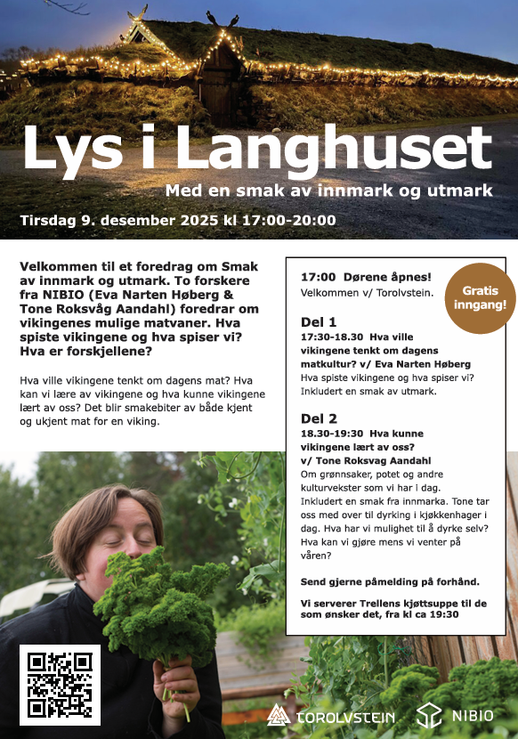 Forskere fra NIBIO på Tjøtta og fra Svanvik i Øvre Pasvik stiller på «utlån» i Langhuset og skal inspirere besøkende om mattradisjoner fra Vikingtiden og fram til i dag – fra både innmark og utmark. Det vil bli anledning til flere smaksprøver. Langhuset serverer også Trellens kjøttsuppe – med innlagt konkurranse og premiering. Se påmelding og annonse nedenfor.